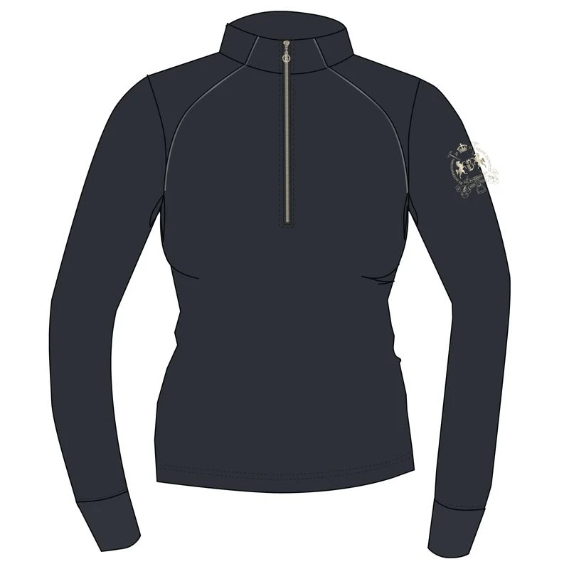Perfect training shirt for layering or spring days with a moisture wicking fabric that feels cool against the skin and has a UV protection. The mesh below the armpit for increased breathability. A delicate gold B Vertigo lettering below the back neck and logo on the left sleeve top of the classy design. Matching pale gold zip.