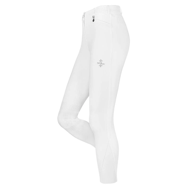 These mid rise breeches have a classic cut with slash front pockets and comfistick silicon knee patches. The fabric is a comfortable four way stretch, and the elastic leg bottoms slide easily into your tall boots. The back V shaped yoke and Euro seaming create a streamline flattering back view.