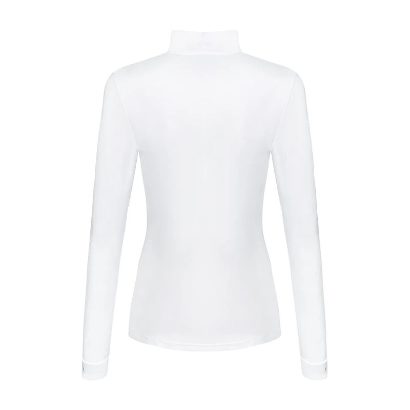 The Meredith is made of stretchy, elastic, and breathable tech fabric. Not just an athletic shirt, the Meredith is good looking too! It is decorated with discreet crystal applications on the collar, front and cuff. No need for a stock tie here!
