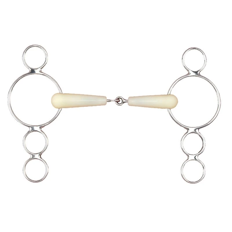 Featuring an apple scented polymer mouthpiece with a single joint, this bit encourages salivation and chewing at the bit to loosen the jaw. This bit is designed to be used with a snaffle rein on the large ring with a curb rein that can be used on the two lower rings for an adjustable amount of leverage.