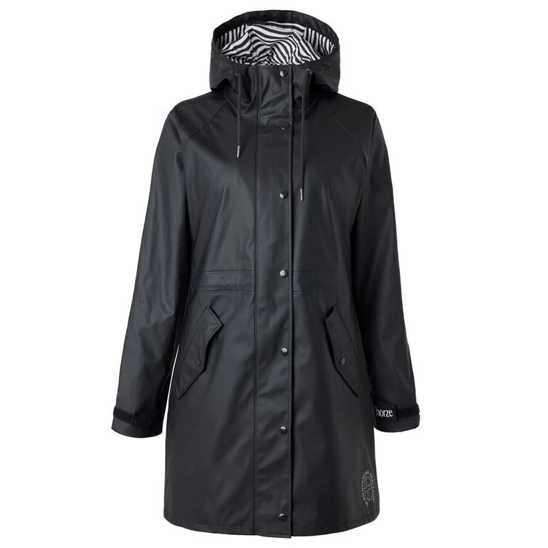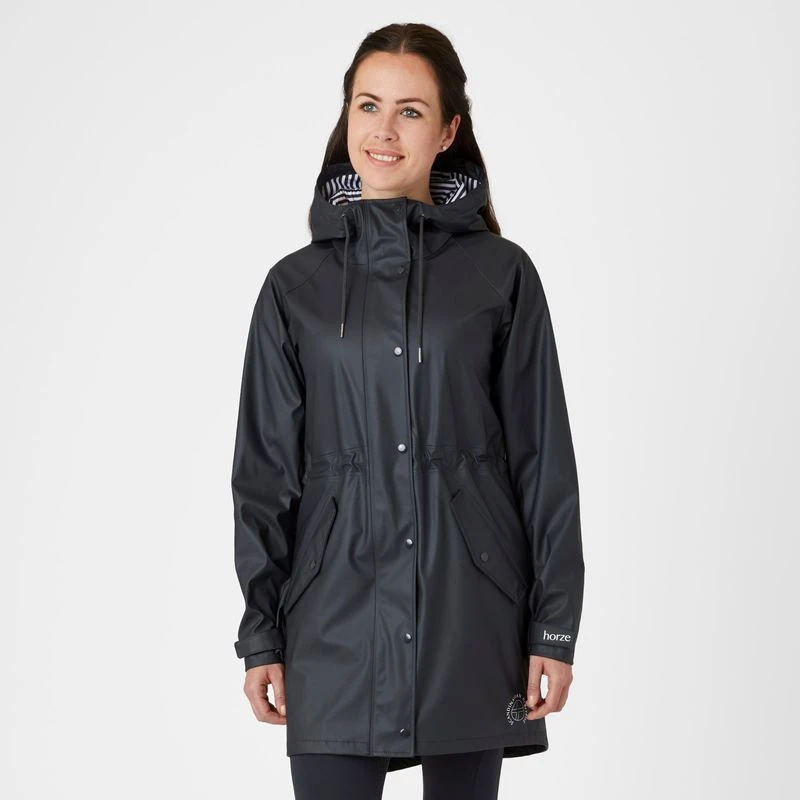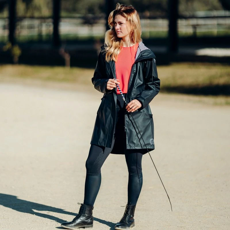 The Horze Dania Rain Coat is super functional and practical. Waterproof material keeps you dry, and jersey lining keeps you warm. Adjustable hood, waist and cuffs ensure the perfect fit. Back slits with press bottons easily fit over your saddle, and keep it dry. Pockets provide room for your belongings. Stylish colors add fun to rainy days!