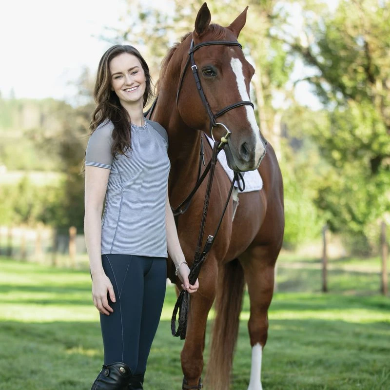 Made from Air-Tech fabric, this short sleeve Air-Tech top is a perfect base tee. For optimal cooling, it’s designed with meshed raglan sleeves and a keyhole opening at the upper back. The super flattering curved hem and exclusive Irideon horsehead camo print side panels on the energy blue and radiant peach color options make this tee stylish and sporty.