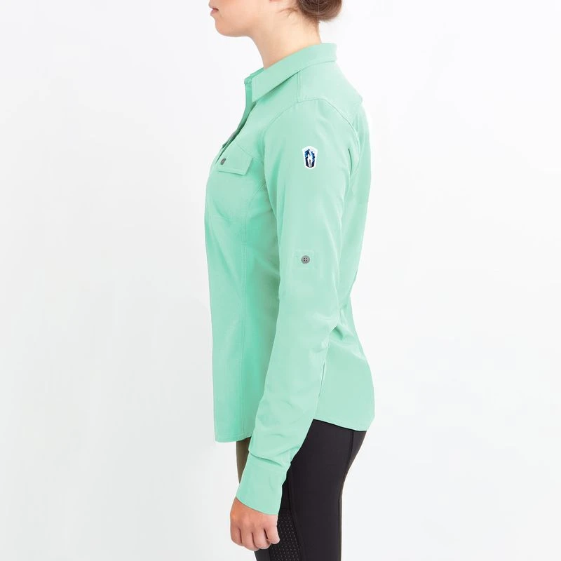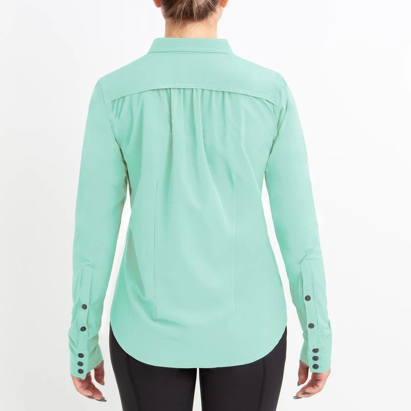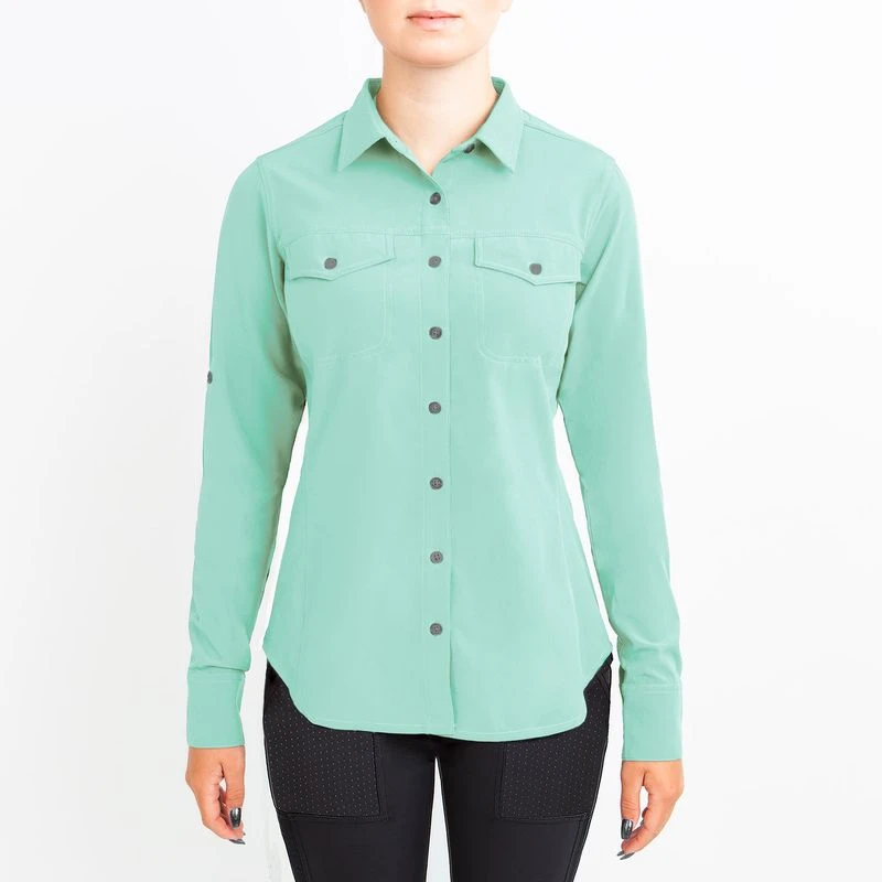 This lightweight long sleeve shirt is made of 4 way stretch fabric paired with IceMesh. It is breathable, moisture wicking, smooth and cool to the touch. The back darts add shape with out being too fitted and the long sleeves can be rolled up and buttoned.