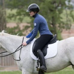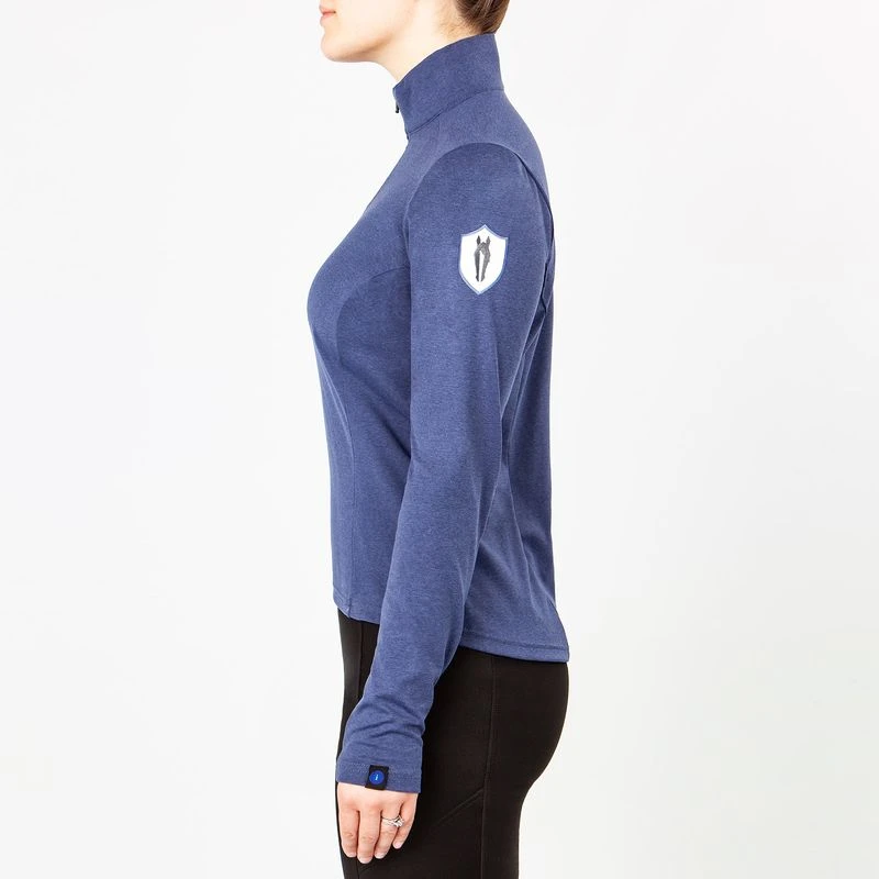 This zip front top is made of a double brushed interlock knit that provides light compression and a cozy feel. It has AirTech panel thumbholes that are designed to keep cold air out. The is zipper is “no chatter” and locks into place, while the collar can be worn up or down. The elliptical hem provides full coverage in the saddle.