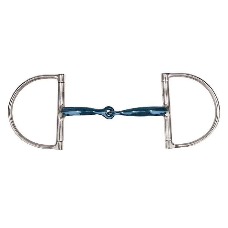 The blue steel finish of this bit works similarly to a copper mouth, having a taste that is accepted by most horses and that encourages salivation by encouraging the horse to mouth the bit. This bit features an egonomically-curved mouth piece with a single joint. The large, hunter style D-ring cheekpieces offer some directional support.