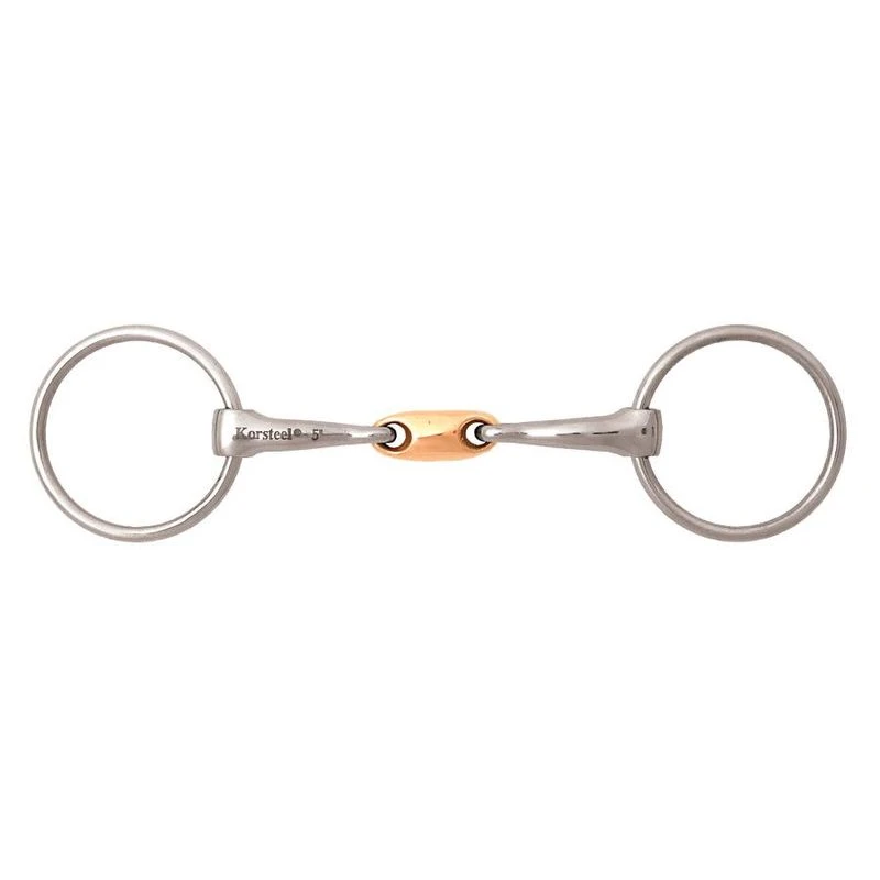 This bit combines a loose ring cheek with a curved oval link multi-jointed copper mouthpiece that encourages salivation. Popular in the dressage court.