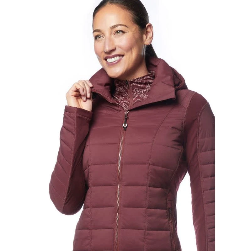 Ergonomically shaped stretch fleece panels are key to unrestricted movement and flattering fit. Hybrid jacket design combines lightweight quilted insulation with stretch-fleece providing maximum mobility with high warmth-to-weight qualities. 140-gram poly-loft fill keeps core warm. Wind and weather resistant with fully quilted hood to pull on after the helmet comes off. Two-way front zipper with tall collar, generous interior pockets and two exterior zip pockets. Sporty back stripe and embroidered horse on shoulders. Riders cut hem is shorter in the front and longer at the back for in-saddle performance.