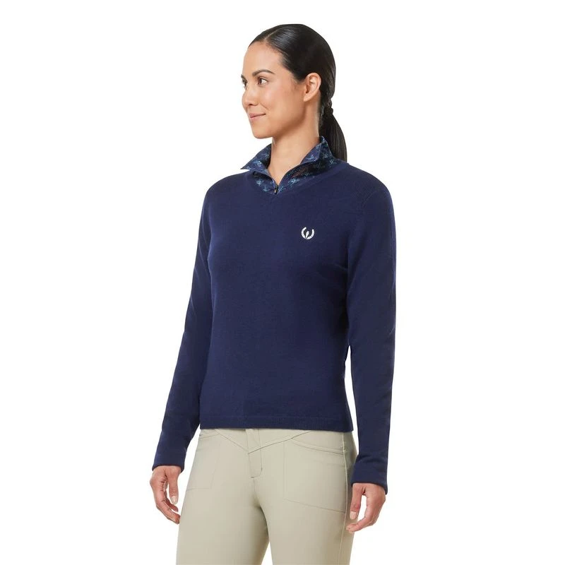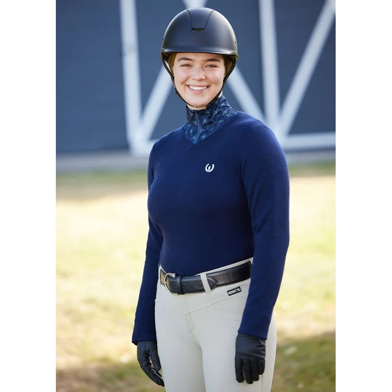 Smart and classy on its own, this washable Merino wool blend layer also looks great with the collar and cuffs of a Kerrits Ice Fil Long Sleeve Shirt peeking out for a pop of color, print, or both!