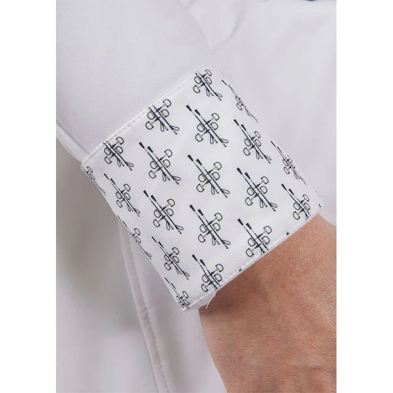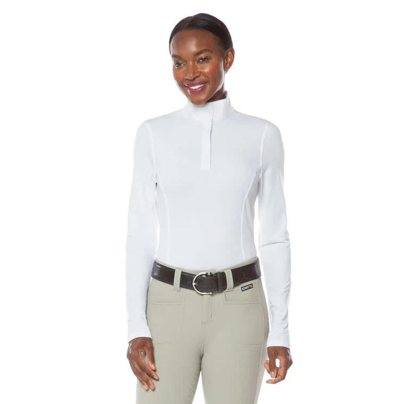 The super soft and stretchy knit fabric has a cozy brushed interior for core warmth without sacrificing the performance and fit of a traditional show shirt. Flat-seam construction lays flat for smooth layering and gives a semi-fitted, feminine shape. Exterior sheds hay, horsehair, and dirt for a crisp look in and out of the show ring. Exclusive Kerrits Chevron Bit print in collar, equestrian cut hem, and a stock tie loop.