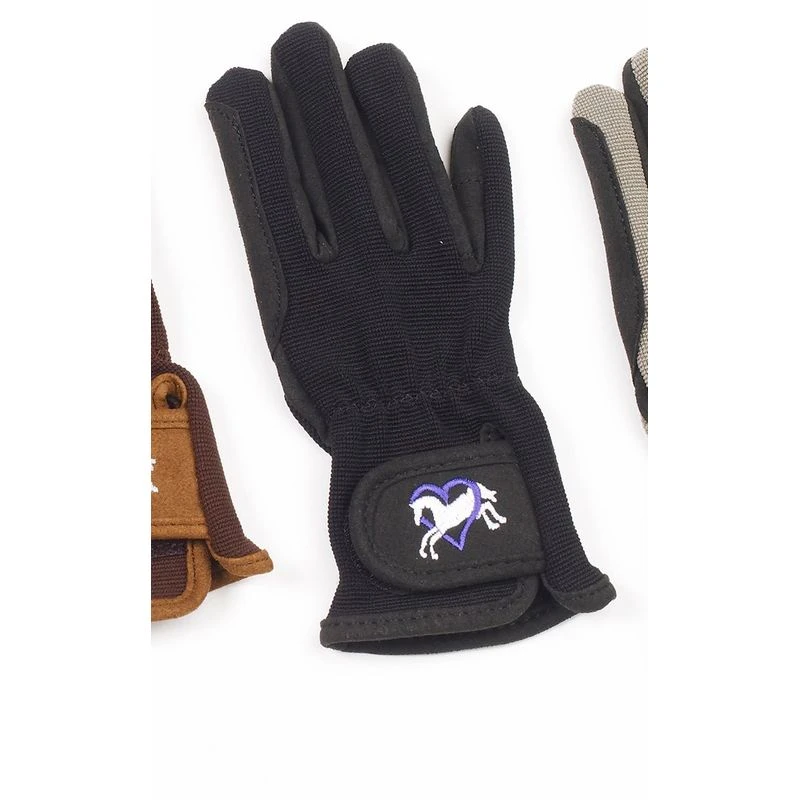 These Syn-Tec stretch suede gloves with a heart and jumping horse embroidery design are the perfect riding gloves for horse-crazy kids. Featuring an adjustable fit with a secure hook and loop wrist closure. This fun glove coordinates beautifully with the Kids’ Hearts Half Chaps.