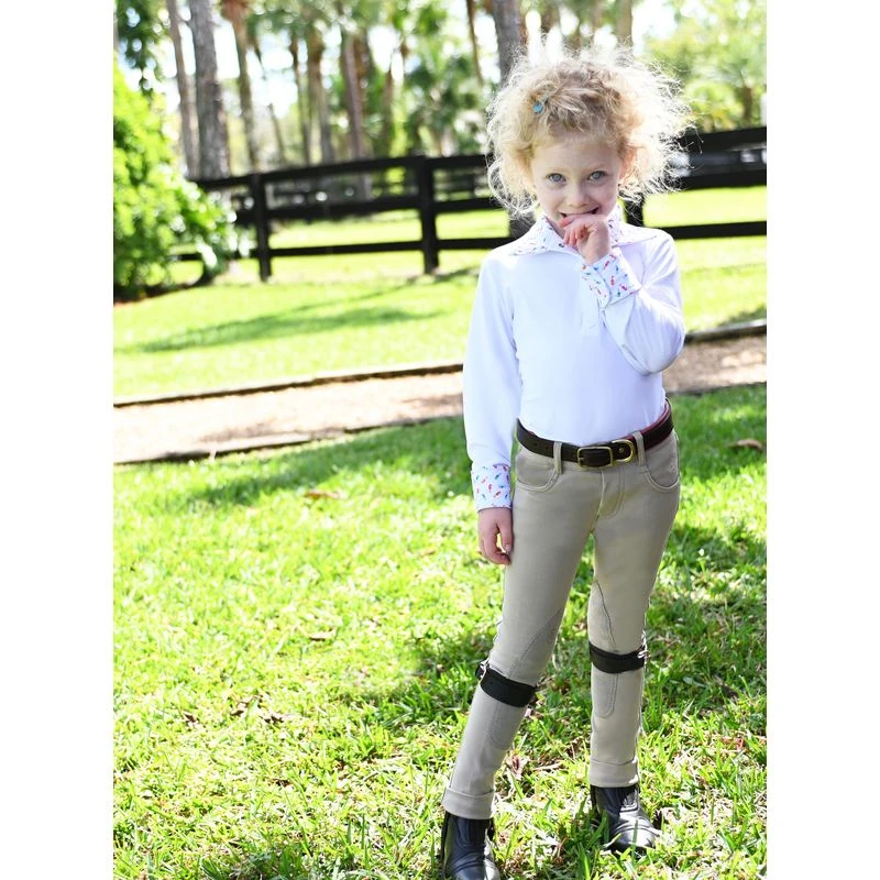 Constructed in mid-weight cotton spandex melange fabric with traditional shaped front pockets, shaped stretch spandex ankles, and Syn-Tec Stretch Suede knee patches with a euro seat. Front jean styling makes this cute euro seat breech perfect for casual riding wear.