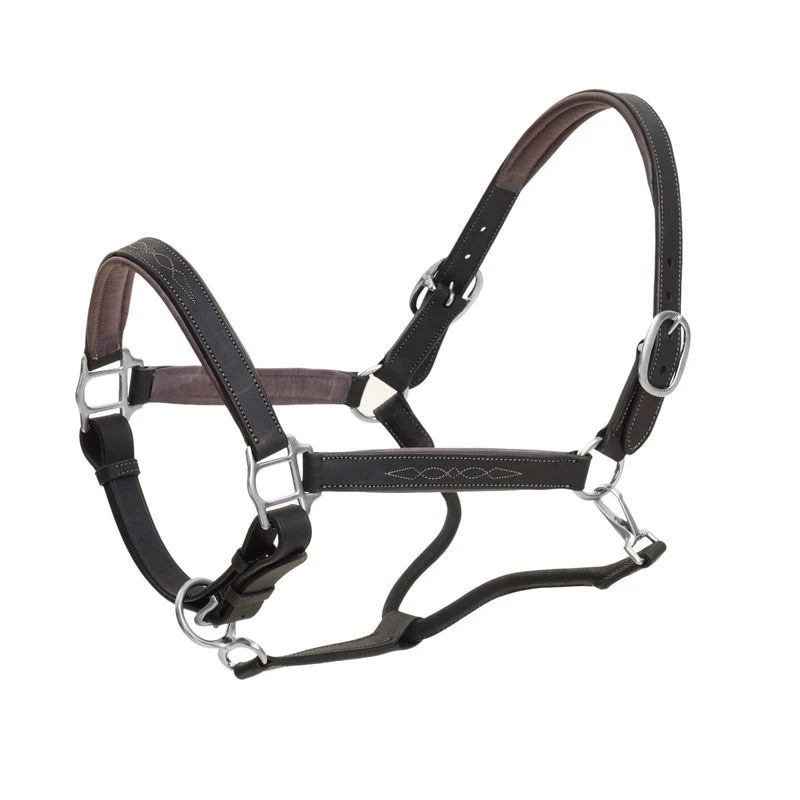 Features double buckle crown piece, adjustable chin, and throat snap. Hardware is solid brass on brown halters and solid brass with brushed nickle on black halters.