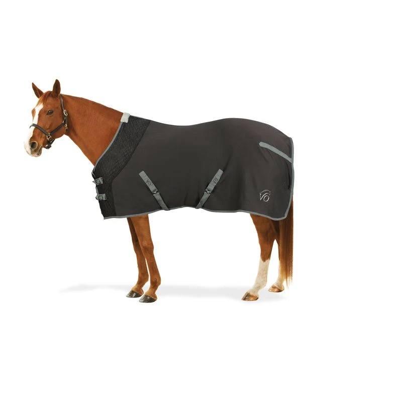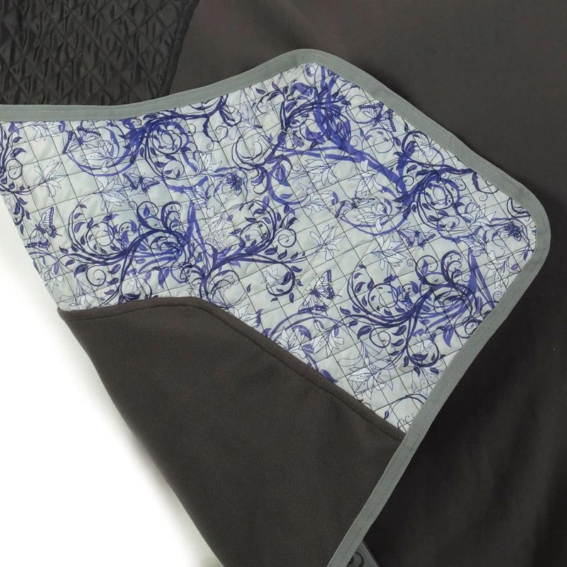 Ovation cooler with printed nylon shoulder lining and elegant quilted nylon outside front panel and smooth poly fleece texture body. Features Exceler snap front closure, criss-cross surcingles, and adjustable elastic leg straps.