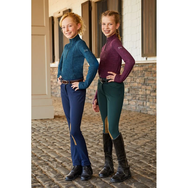 The heathered fabric features a soft hand feel that will keep them comfortable in the saddle while the thumbhole sleeves keep a young rider extra cozy out of the saddle! The sporty seamlines and zip styling ensure that they will be looking as great as they feel.