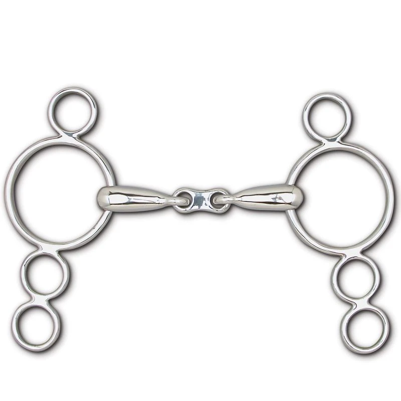 Multi-ring cheeks are often used in the jumper arena. By selecting different rings for rein attachment the rider can adjust the amount of pole pressure. The french link wider hollow mouth will not have a nutcracker action, putting more pressure on the bars than the soft pallet.