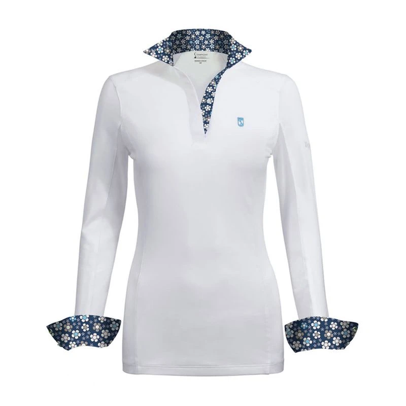 Tredsteps Cool Touch nylon pique fabric has a wonderfully cool feel on your skin while also protecting you from harmful rays and unpleasant odors. Featuring Birds Eye Mesh under sleeves, crisp cotton wrap collars and cuffs, stylish snap buttons and a choice of three trim color print options this is altogether a wonderful show shirt which you can wear with confidence in the or out of the show ring.
