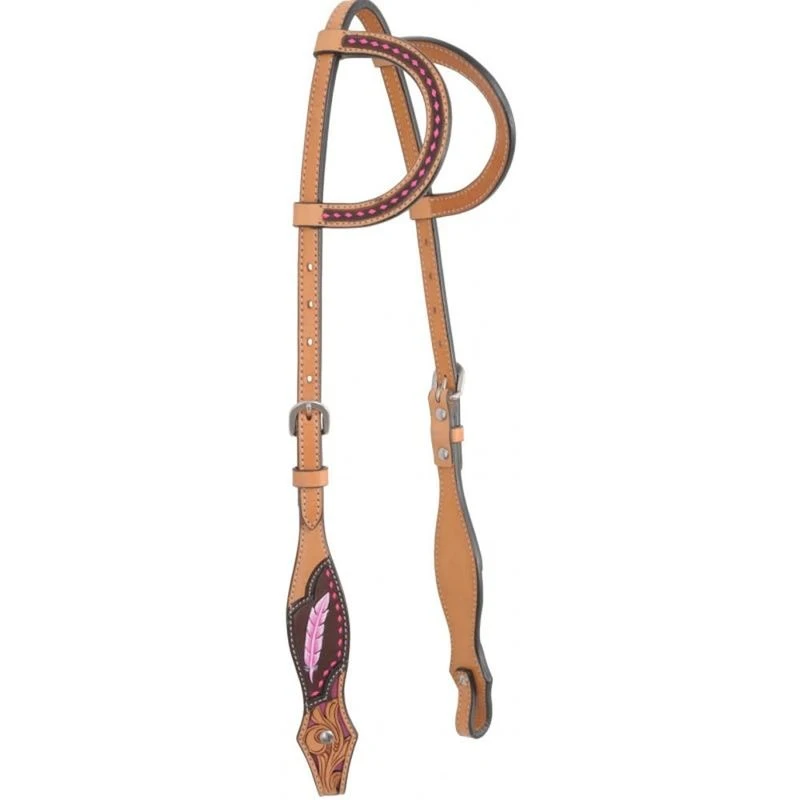 This double ear headstall features contrasting whip stitching accents along the ears with an embossed feater and tooled leather design on the cheekpieces. The cheekpieces have Chicago screws for easy changing of the bit.